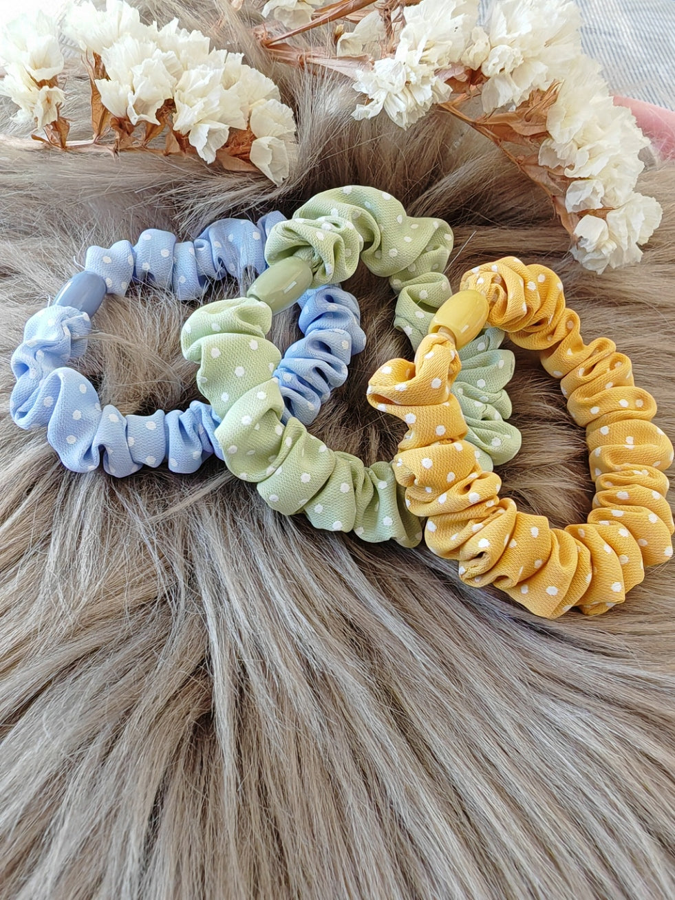 Mit dem Haargummis Trio Dots erhalten Sie ein praktisches Set aus drei Haargummis in niedlichen Pastellfarben mit Punktmuster. Sie sind nicht nur funktional, sondern auch ein echter Hingucker für jeden Haarstyle.