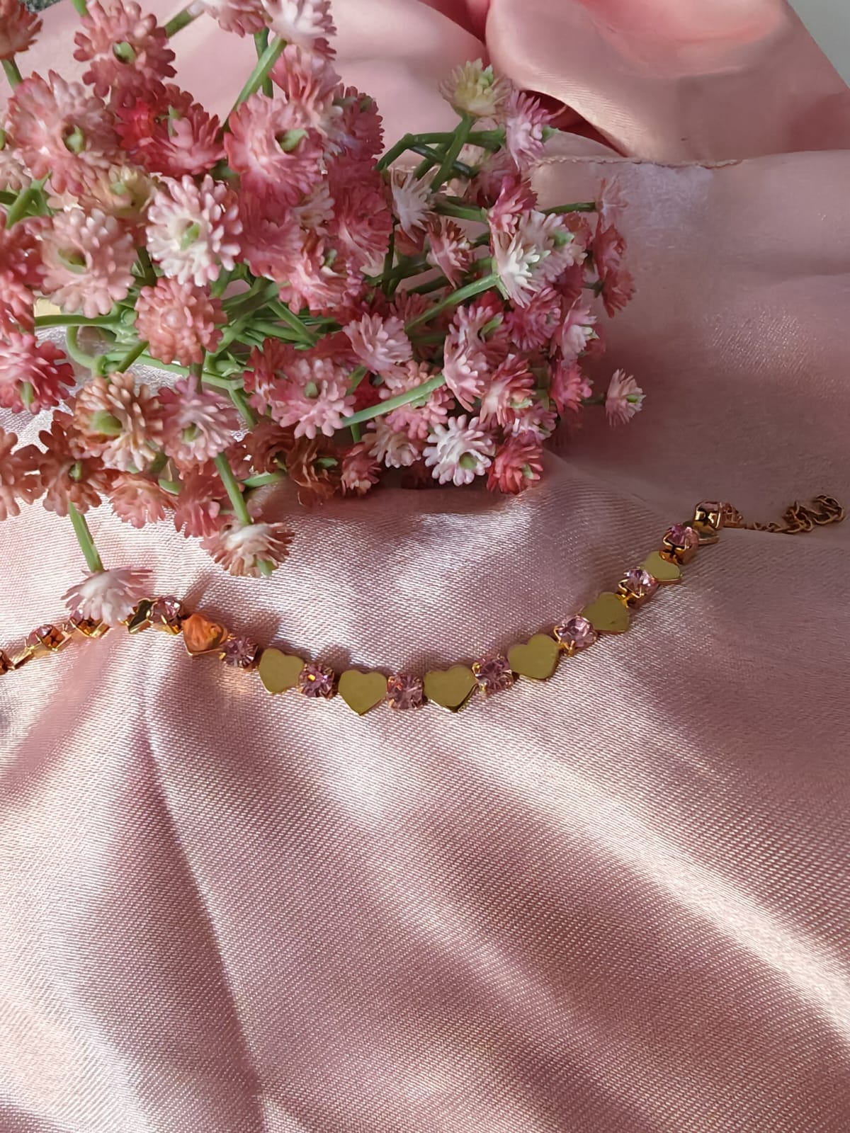 Herzallerliebst und einfach nur unbeschreiblich schön ist das Armband "Eve" mit den rosefarbenen Zirkonia-Steinen und den goldenen Herzen.